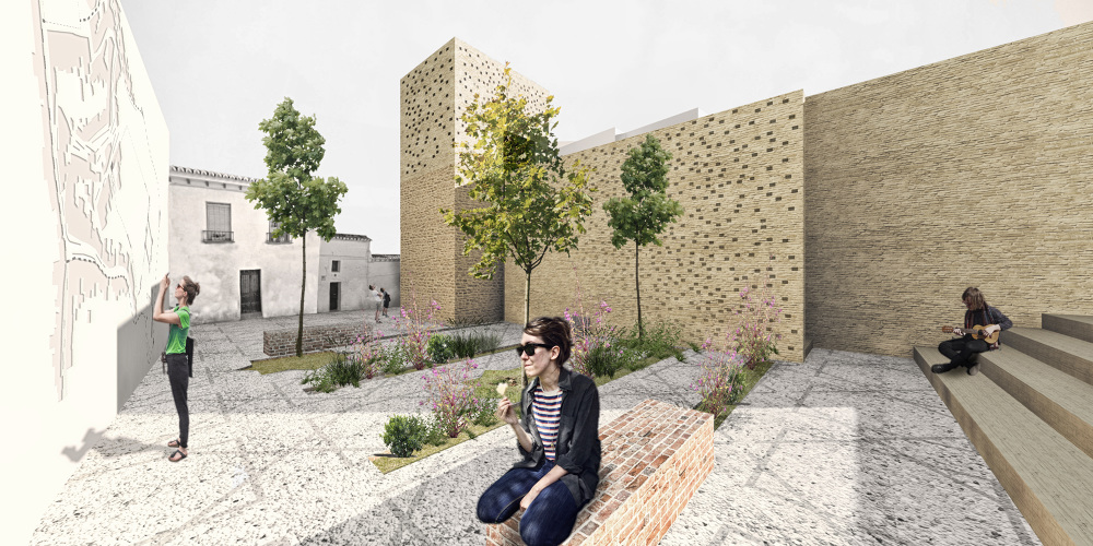 Tras el derribo de la vivienda adosado al cubo de muralla surge la oportunidad de confrontar el arrabal al lienzo que le da origen. Proponemos un espacio abierto, donde el ajardinamiento, los recorridos de agua y el contenido divulgativo sean los principales elementos del discurso. La posibilidad de subir y acceder a la torre, tratada como mirador, permite la conexión del acceso con los otros miradores entorno a la fortaleza. La escalera se trata como un lienzo de muralla que permite cerrar la parcela en su límite noreste. Enfrentada a este, en el otro extremo de la actuación, la medianera con la vivienda colindante se convierte en un lienzo en blanco, soporte de los contenidos a divulgar. La parcela queda abierta a la ciudad y al cerro en sus extremos menores, enfatizando su función como acceso al recinto amurallado del castillo.