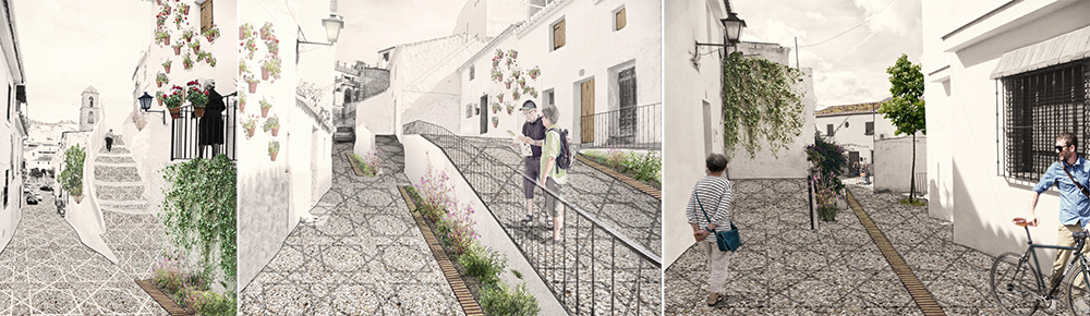 El resultado de la adaptación urbana a la topografía son una serie de planos verticales públicos, que actuando como líneas de fuerza estructuran y caracterizan el espacio. Incisivos cortes sobre la trama urbana, donde brota nuevamente la vegetación y el agua. Espacios de descanso en el recorrido al arrabal, pero también espacios para la vida vecinal entendiendo que su calidad final dependerá en gran medida de la intensidad de las relaciones sociales que posibilite y por su capacidad de estimular la identificación simbólica, la expresión y la integración cultural.