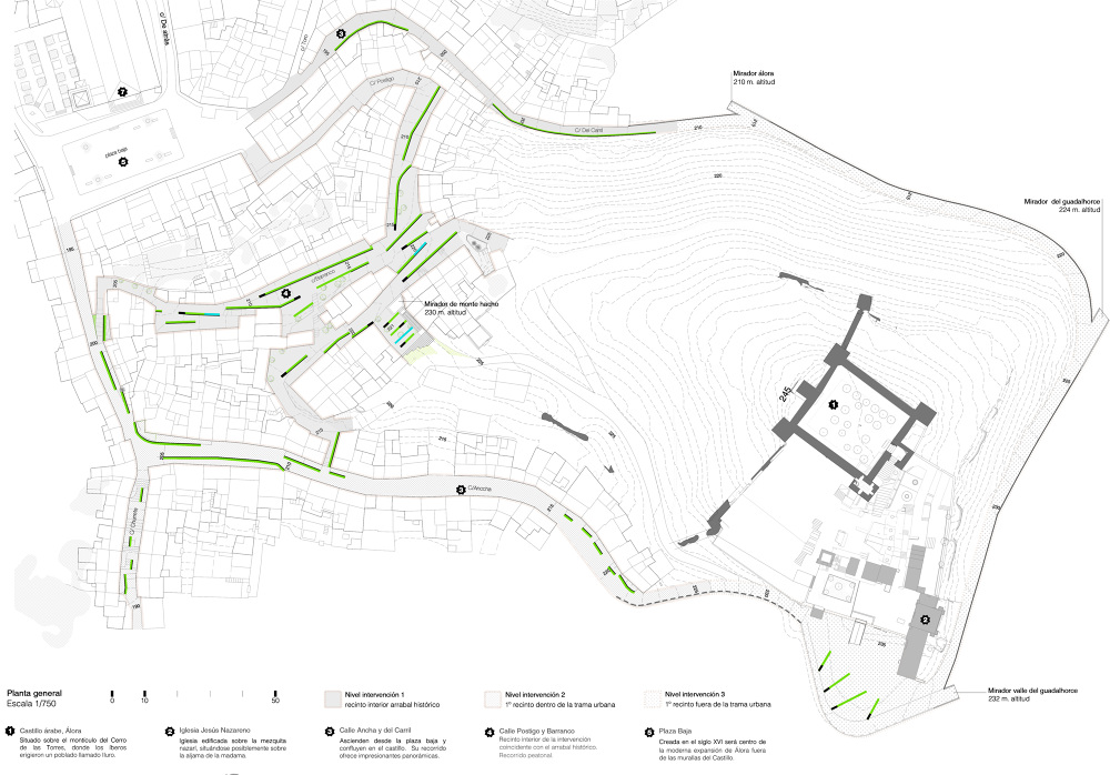 Intervenir en el conjunto de espacios públicos que conforman el arrabal histórico del castillo de Álora, más allá de las exigencias implícitas al actuar en un tejido urbano existente, nos impone la obligación de descubrir aquellas cualidades del lugar que lo han hecho tan atractivo para el hombre desde tanto tiempo atrás y que deben nuevamente, dentro de lo posible, ponerse en valor.