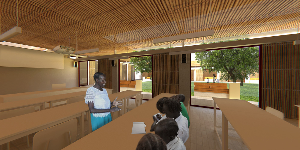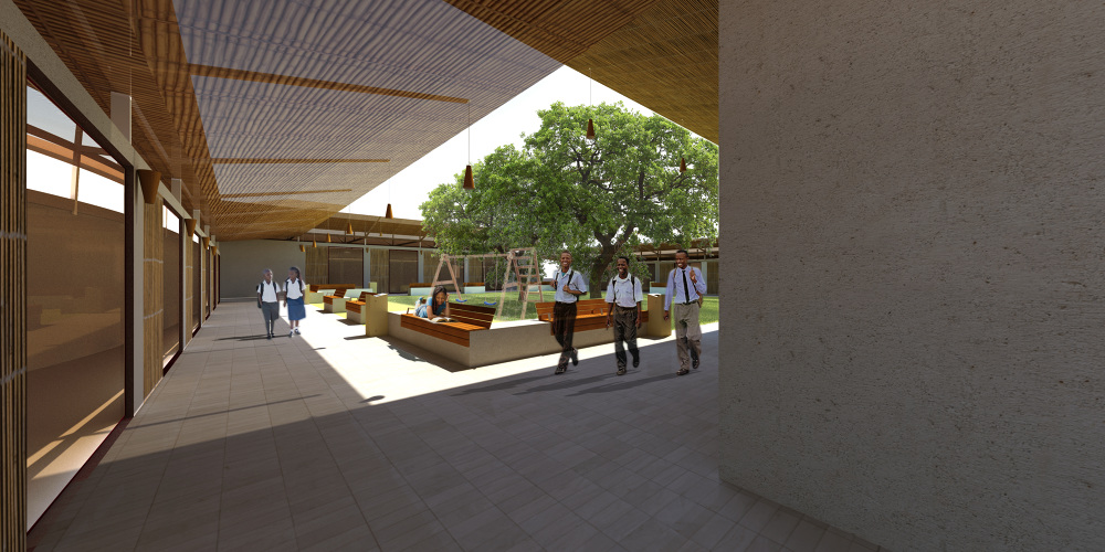Los diferentes volúmenes de las aulas quedan unidos por las cubiertas que se prolongan más allá de los límites construidos de las edificaciones para generar un espacio exterior cubierto en torno a ellos.