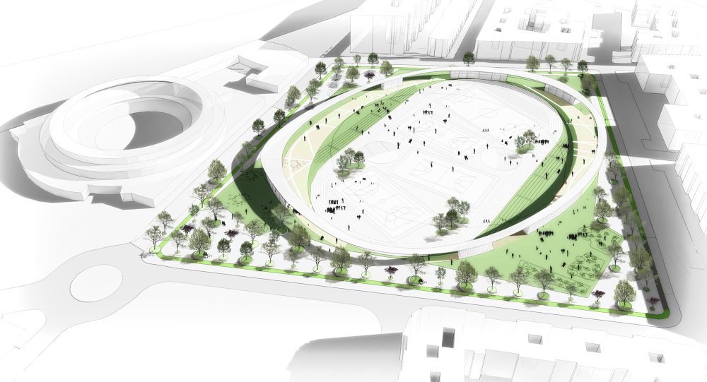 Un liviano volumen construido, de forma anular, estructurará el ámbito de «Los Bajos». Dicho volumen se entenderá como una gran pérgola que adquirirá anchuras variables en función de su organización interior, para albergar las pequeñas edificaciones que dan servicio a los usos previstos. Un sencillo y rotundo gesto imprimirá el carácter icónico a la actuación, y dialogará con la Plaza de Toros, formando ambas un único ámbito unido por la semipeatonalización de parte de la calle que las separa. El «edificio» establecerá áreas diferenciadas, pero conectadas visualmente por diferentes grados de transparencia.