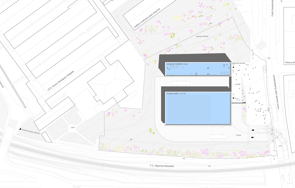 La intervención intenta liberar la mayor superficie de la parcela posible, realizando una actuación compacta, que permita generar nuevos espacios públicos para la ciudad. La parcela queda liberada en su perímetro noroeste, formando un nuevo ámbito entorno al instituto Doctor Rodríguez Delgado, la nave multiusos para mayores y el antiguo museo del mueble rondeño. Un parque-cultural que permite la conexión a través de la parcela con las calles Fernando de los Ríos y la calle del Guadalcobacín, conexiones ambas con la Avenida de la Victoria. El talud natural, que forman la vía del tren y la parcela, acondicionado con arbolado que reduzca el impacto acústico, conforma un nuevo paseo, en el extremo sur de la parcela, paralelo a la vía del tren. Ampliamos de este modo la conexión de la parcela con el tejido urbano de Ronda, limitado si no, únicamente, a la calle Guadalcobacín y a la conexión, mediante un paso a nivel de ferrocarril, con el centro de la ciudad. .