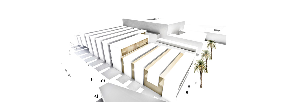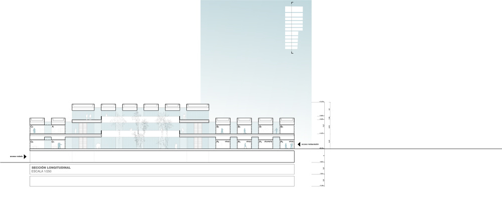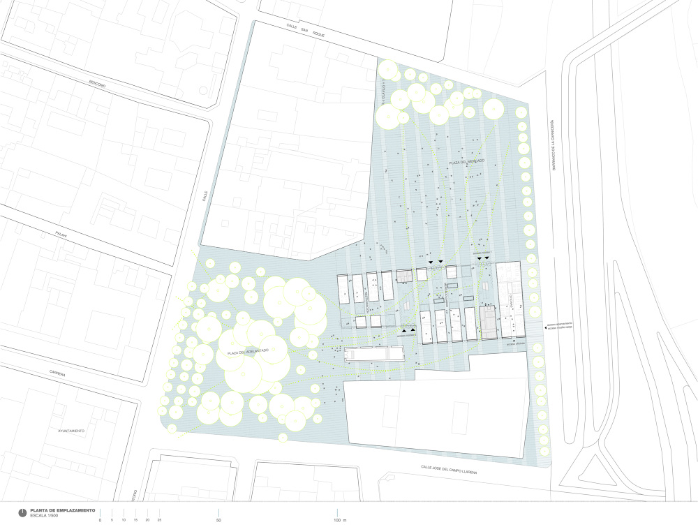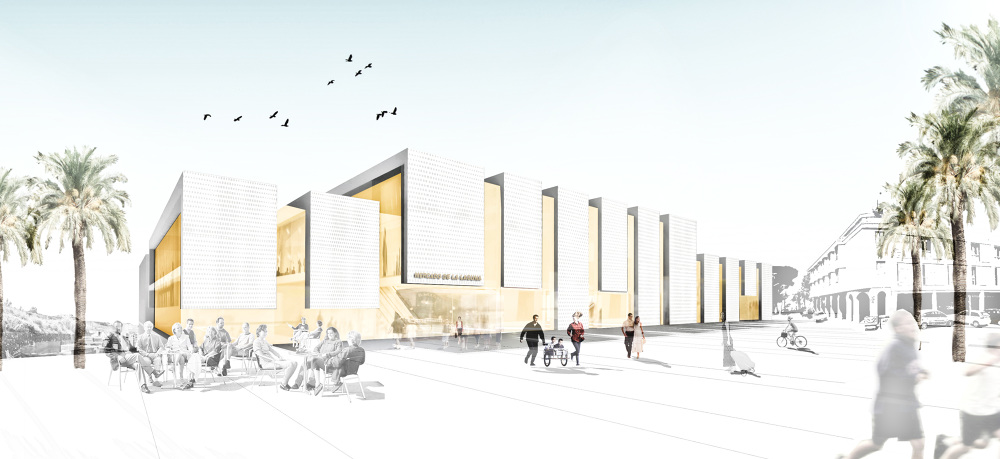 El volumen se genera desde la idea de permeabilidad visual. El programa del mercado se comprime en bandas compactas, las circulaciones entre éstas permiten la entrada de luz al interior y la transparencia visual del mercado que potencia la lectura de su privilegiado entorno.