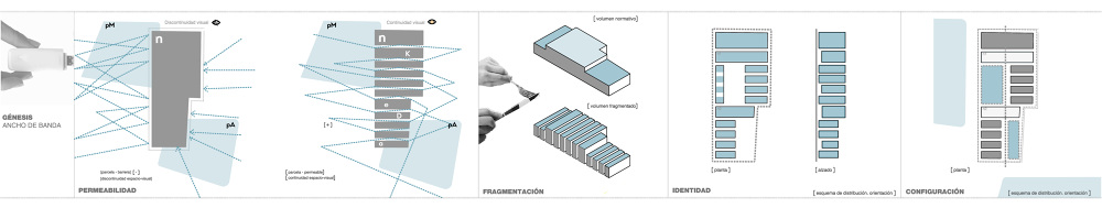 Ancho de banda se presenta como un espacio abierto, no limitado ni cerrado por su perímetro. Su configuración interna potencia la relación con el exterior a través de un ritmo secuencial de lleno – vacío que fragmenta el volumen, permitiendo el flujo de personas por todo su perímetro así como la ventilación natural y la entrada de luz.
