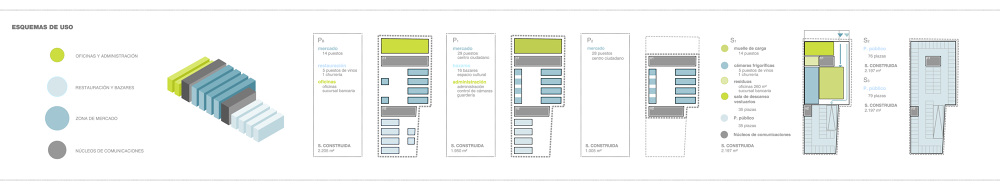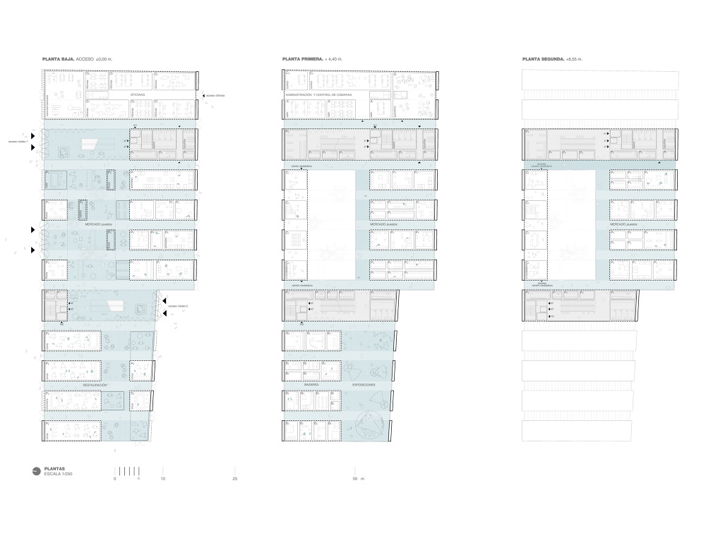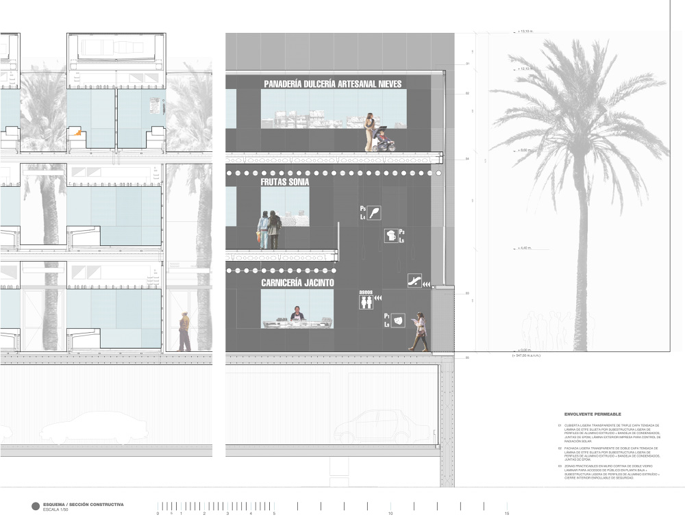 Ancho de banda se configura según una marcada estructuración en bandas “programáticas”, contenedoras de todo el programa, como las manzanas en el trazado hipodámico de la ciudad. El espacio vacío entre ellas desmaterializa el volumen, permite la ventilación natural y el soleamiento del mercado y conforma el espacio de circulación y relación. Surgen, además, vacíos en la trama, como plazas interiores, que aglutinan las actividades más espontáneas.