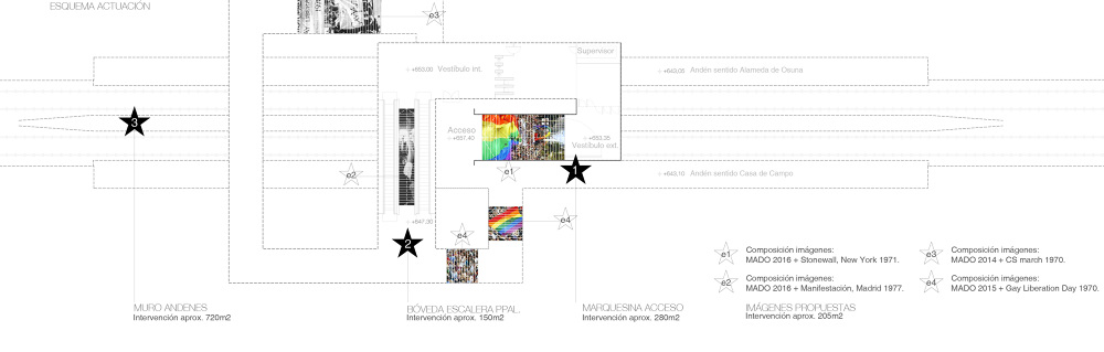 La propuesta se apropia y se nutre de la imagen de Metro como paisaje urbano subterráneo, alterando el menor número de elementos existentes, manteniendo su caracterización e introduciendo superficies reflectantes para minimizar la carencia de luz natural y la perdida de estímulos visuales. La estación se comporta como un lienzo casi blanco, donde junto a los conocidos elementos que cualifican el espacio: bancos, papeleras, señalización, interfonos y carteles publicitarios entre otros, aparecen ahora también los usuarios integrados en el reflejo componiendo un único fondo.
