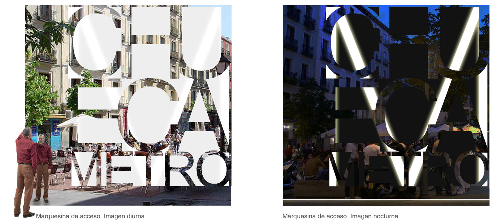 El nuevo acceso planteado en la plaza de Chueca parte de un zócalo continuo, la nueva estructura reflectante asciende perdiendo materialidad, desdibujándose y formando la nueva iconografía basada en la superposición del nombre de la estación, CHUECA, sobre la M de Metro. De igual modo, que en la actuación interior, la materialidad reflectante de la marquesina de acceso pone de manifiesto la función público de Metro mediante la reflexión de la realidad, su paisaje y su gente. Durante el día, la incidencia de la luz resalta el plano reflectante sobre la M, resaltando el nombre de la estación, al anochecer la M se ilumina y destaca sobre el nombre que queda oscurecido por la falta de luz. Un acceso representativo de un barrio cambiante y con una intensa vida diurna y nocturna.