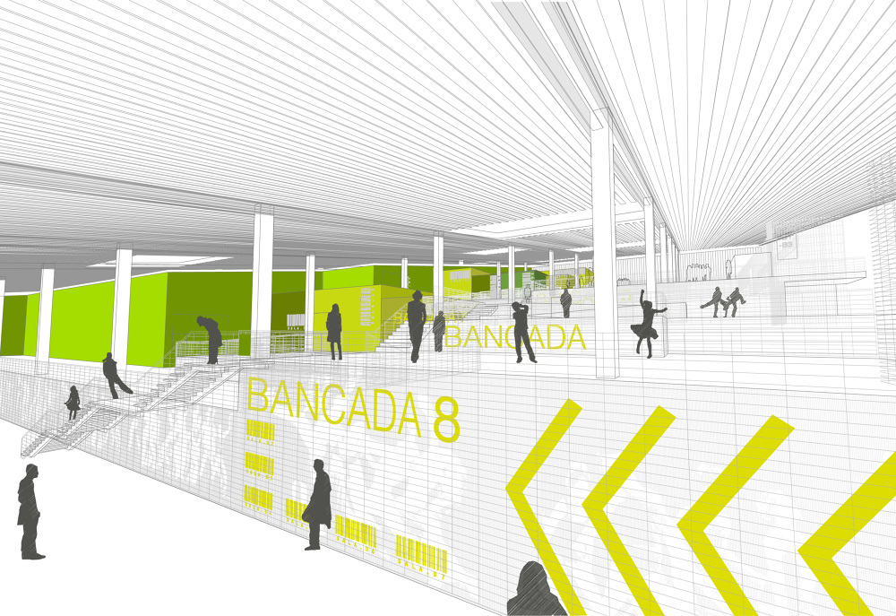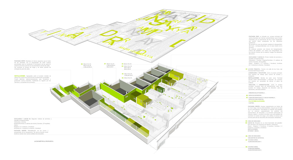 Según nuestro criterio, el objetivo del proyecto de rehabilitación es hacer compatible, en la medida de lo posible, el nuevo programa con el espíritu original del edificio, de manera que la solución a los nuevos problemas potencie la esencia de contenedor neutro del edificio (capaz de adecuarse a distintos usos) y su lenguaje constructivo característico. Al mismo tiempo, rehabilitar y adecuar el pabellón de Bancadas para un uso tan diferente del original, como es el de espacio de ensayo colectivo, implica introducir elementos ajenos al esquema rotundo del edificio original, que enmarca entre la topografía aterrazada y el plano inclinado de cubierta, un espacio continuo y fluido con un recorrido secuencial, idóneo para el uso expositivo.