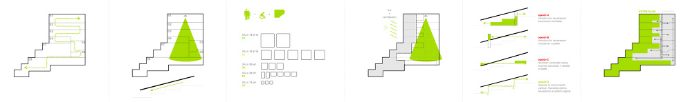 TERMINAL. Que mantiene el espíritu original de espacio continuo del edificio y contiene la parte del programa que es compatible con él, como las propias circulaciones y los espacios comunes, de relación etc.