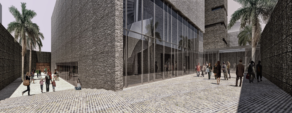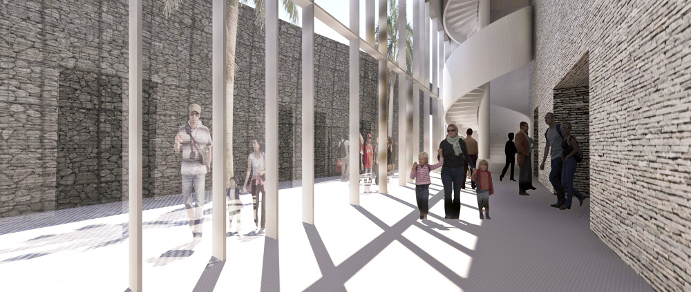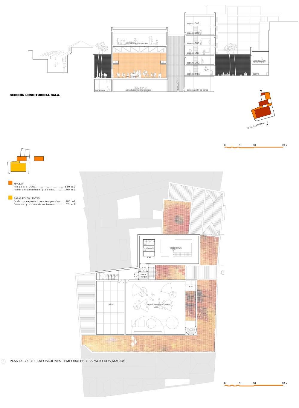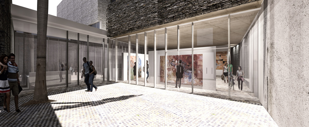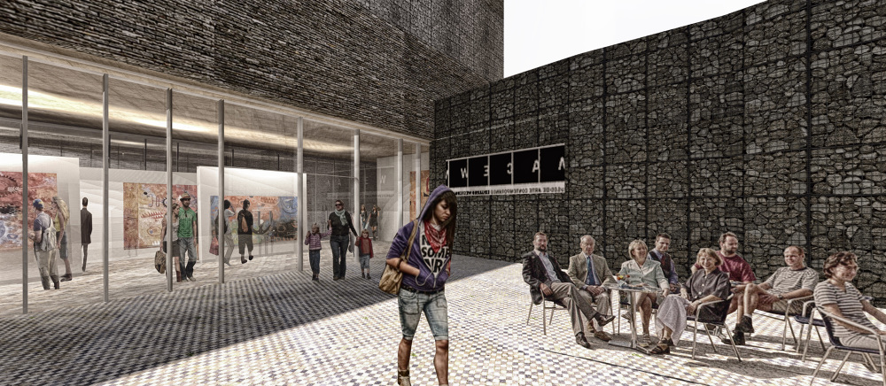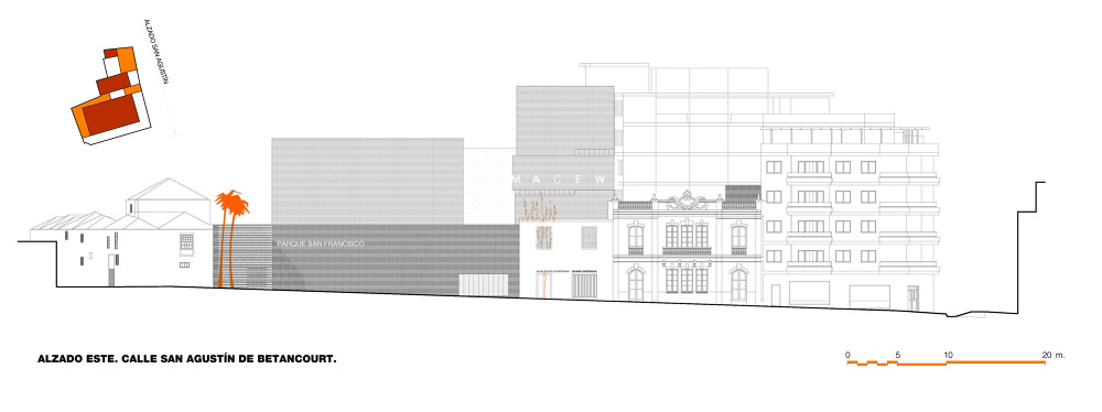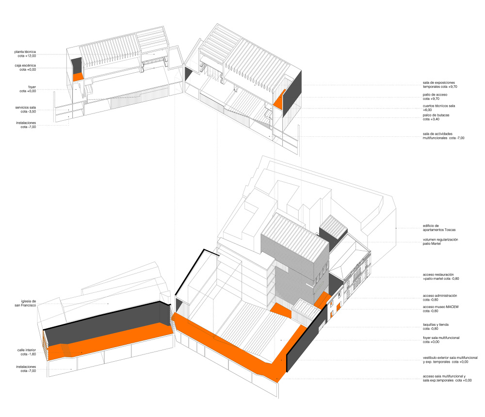 Un muro, que dibuja la alineación obligatoria, es el elemento final que dota al espacio libre de su necesario carácter interior y sirve como elemento de transición y vestíbulo exterior de la parte pública del programa, la sala y el MACEW. La apertura del muro permite independizar la iglesia de la propuesta, abriendo una nueva calle en la trama de la ciudad, enriqueciendo la experiencia del espacio urbano. Su condición temporal permite su uso como elemento amortiguador de la actividad generada por el nuevo conjunto en su entorno.