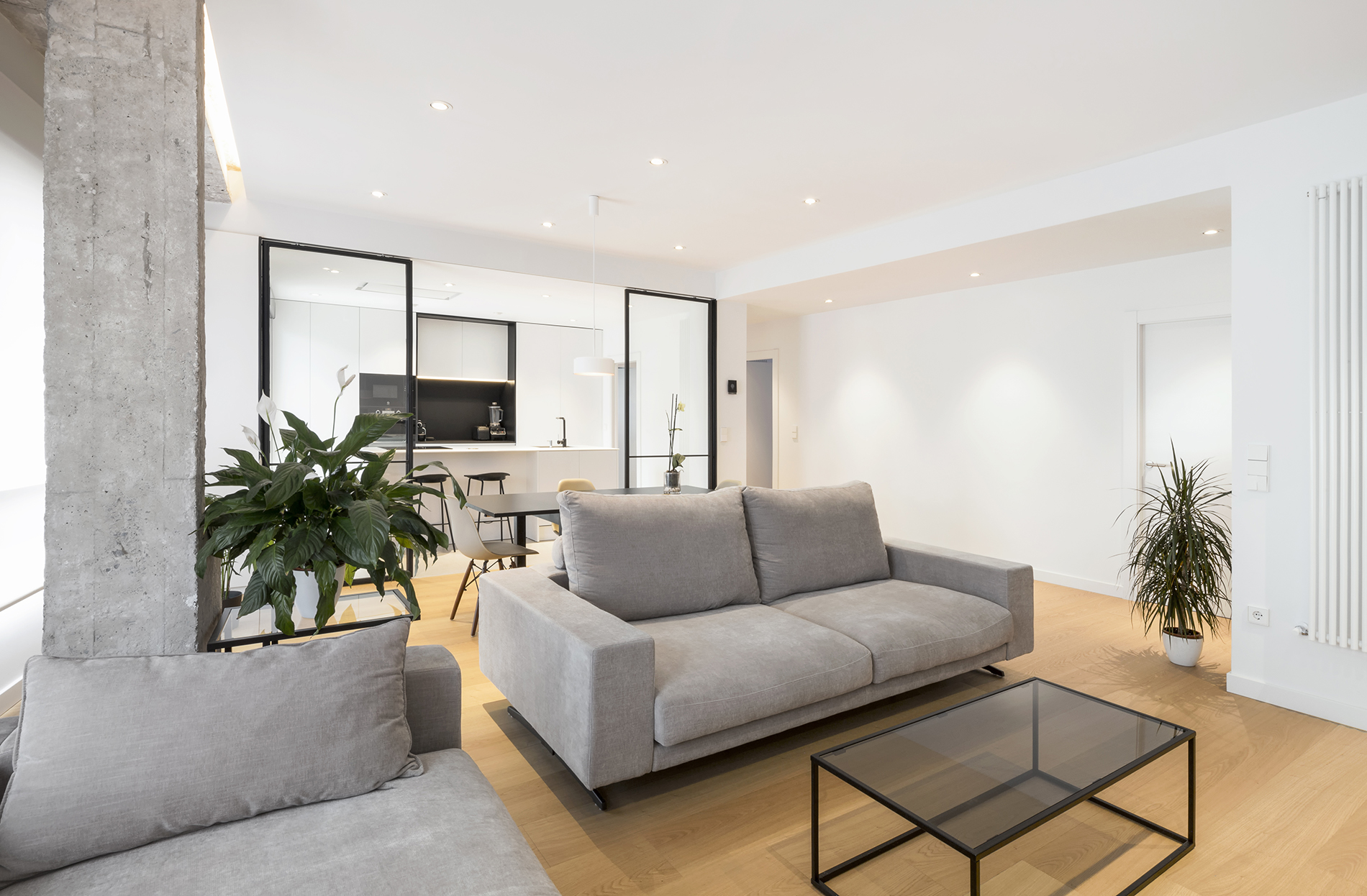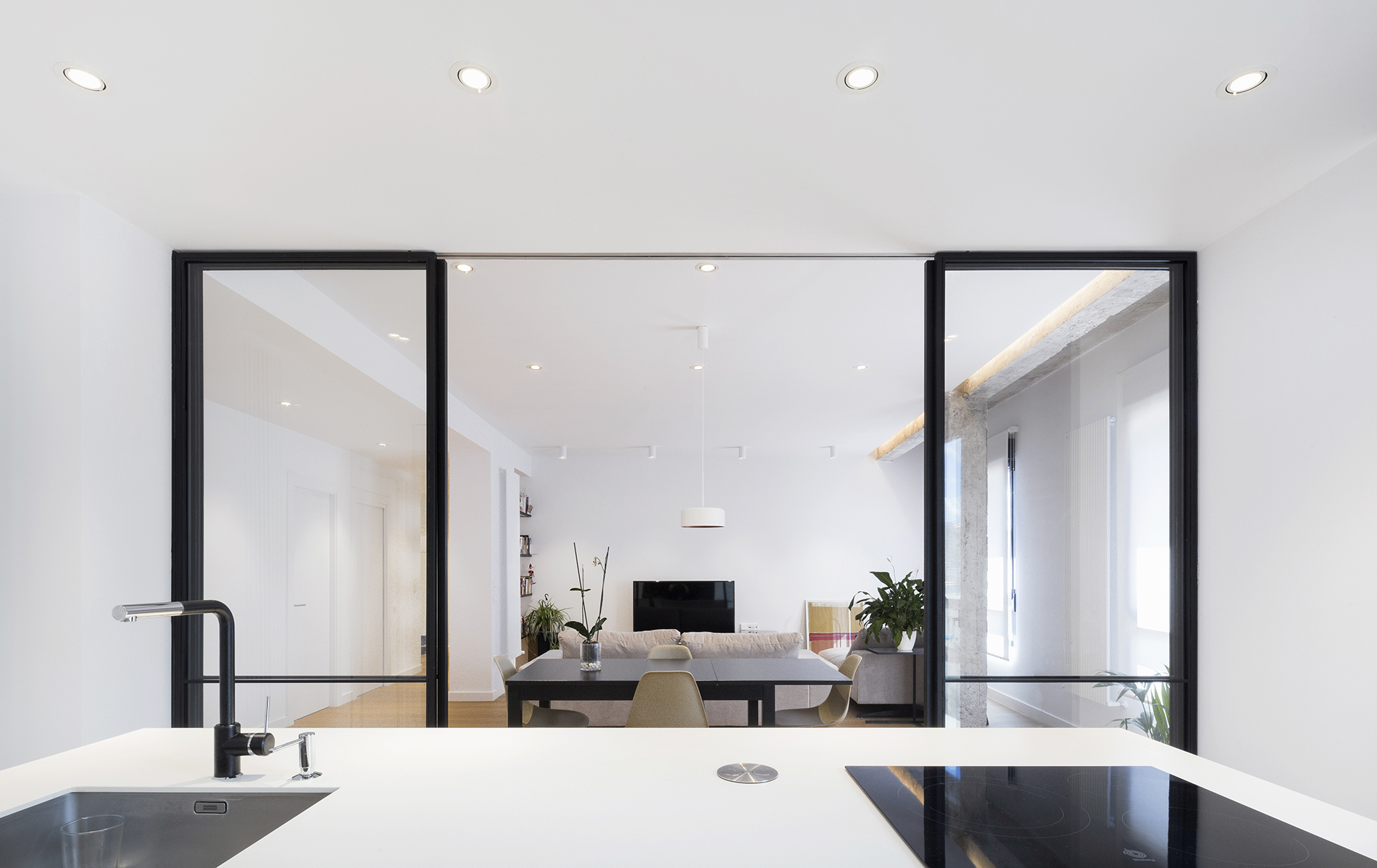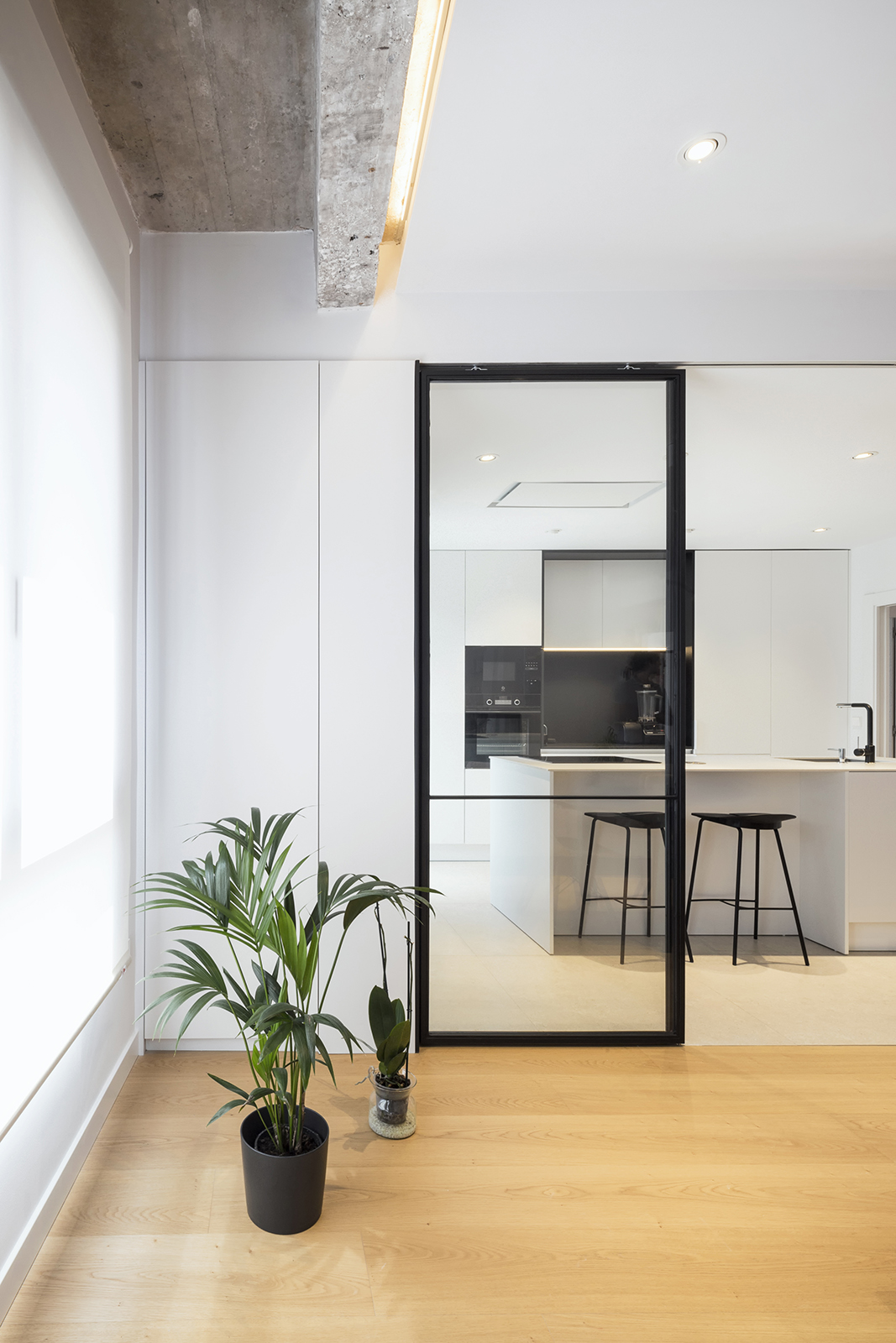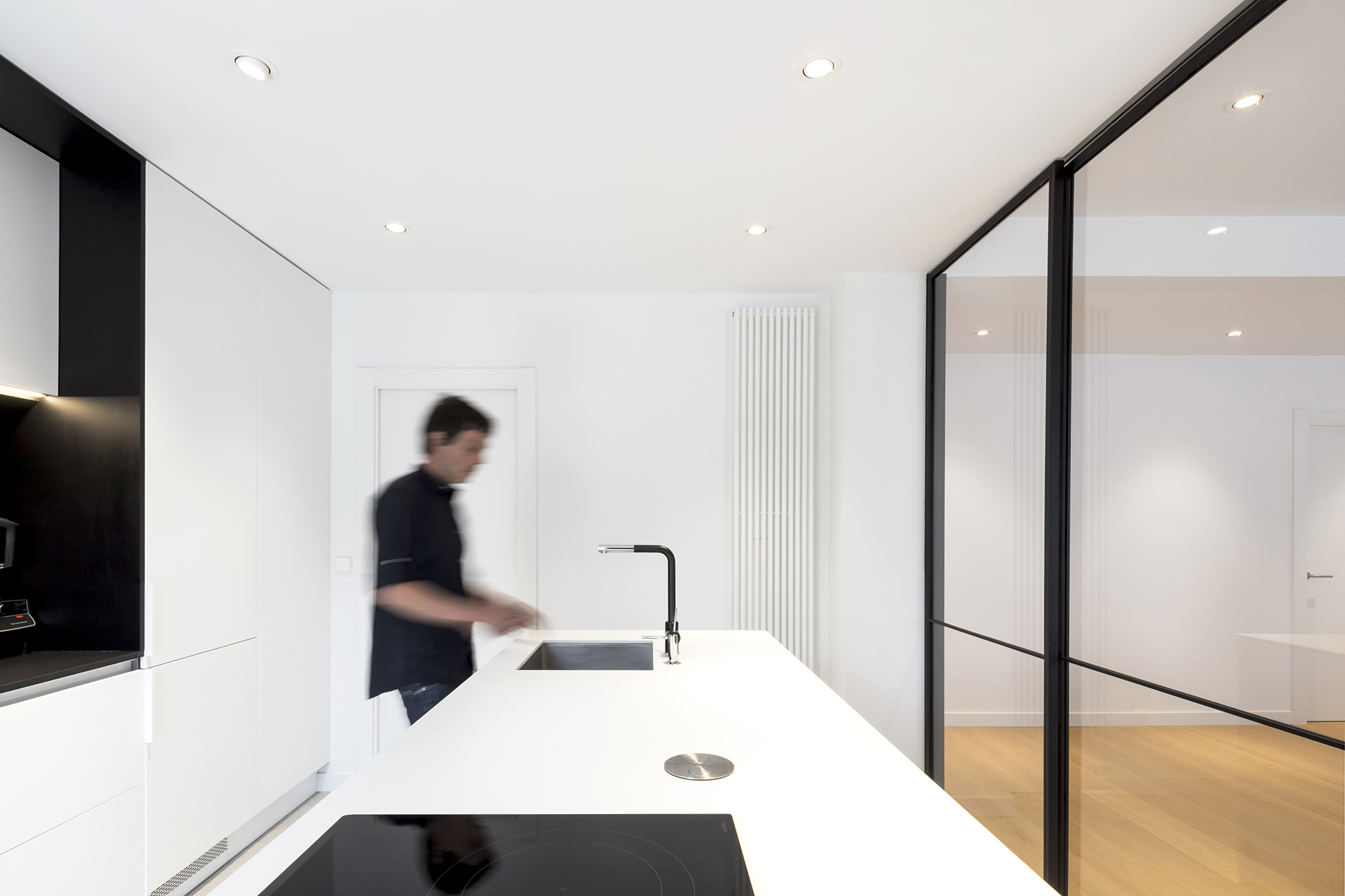 El eje sur que configura el salón-comedor-cocina es un gran espacio abierto que tiene como telón de fondo la isla y el frente de muebles altos de la cocina, que queda separada del salón – comedor por una división corredera transparente construida al modo de “verrière” con acero lacado en negro mate y vidrio. En torno al eje norte se articulan tres dormitorios. El programa se completa con un baño, un aseo de cortesía y vestíbulo. La vivienda cuenta además con un balcón-galería. El suelo de la vivienda es de madera de roble natural a excepción de las zonas húmedas que tienen un gres porcelánico de gran formato.
