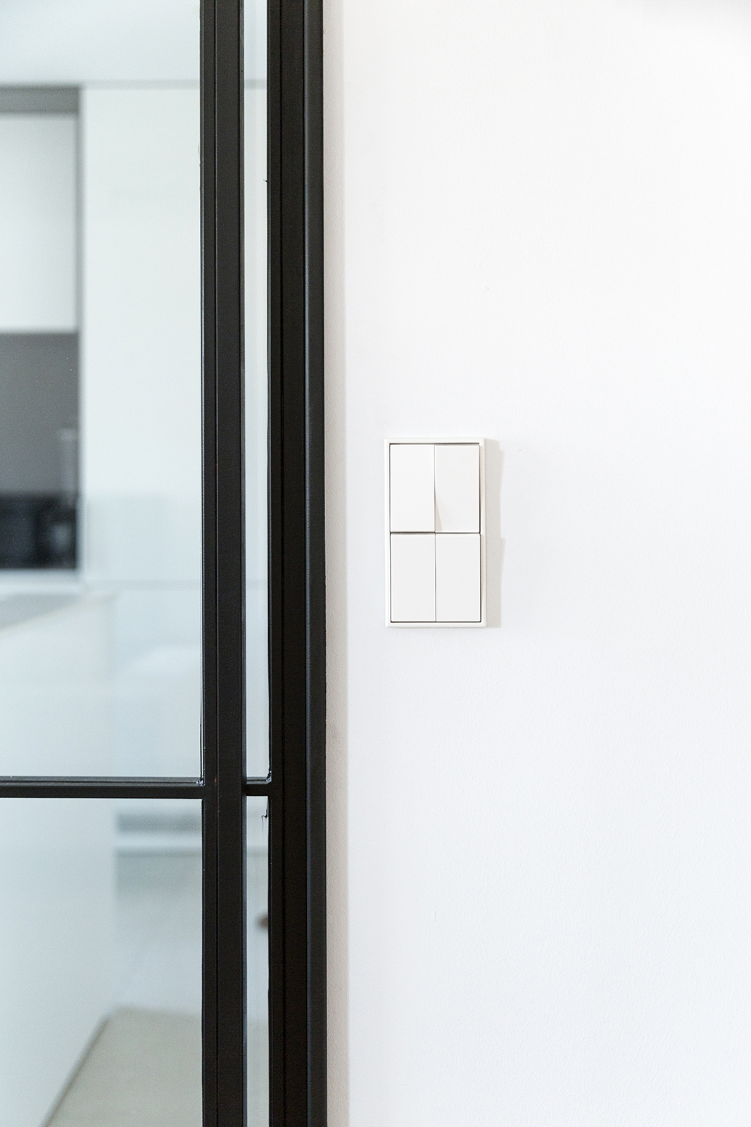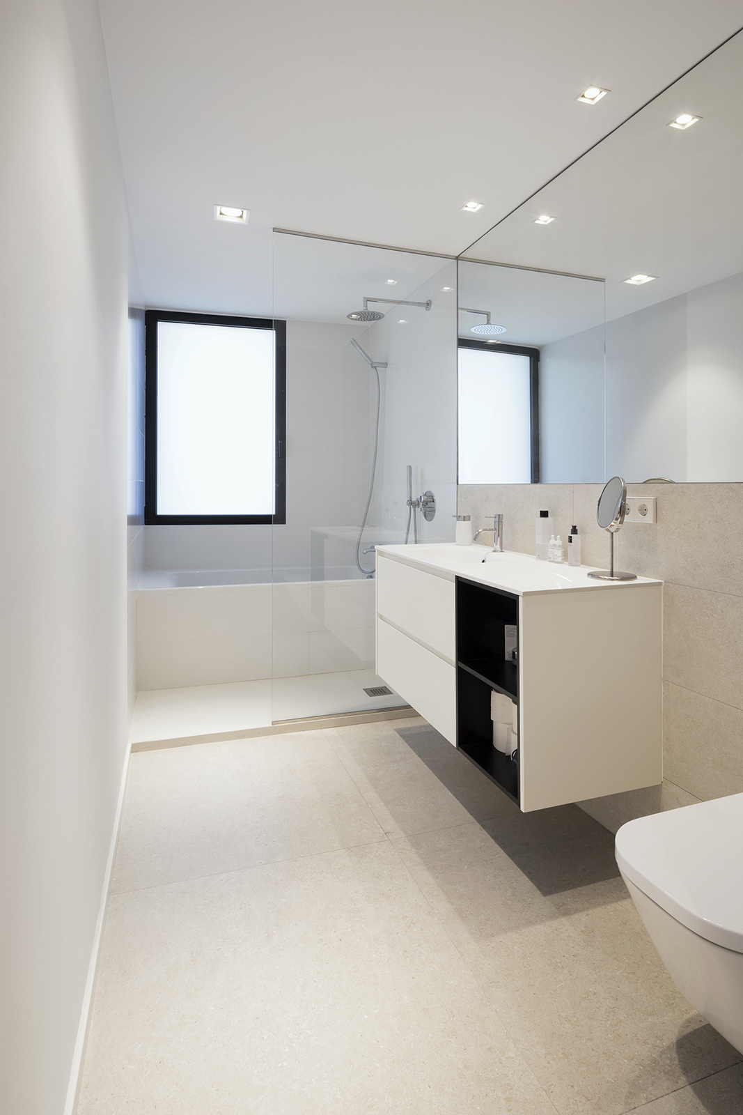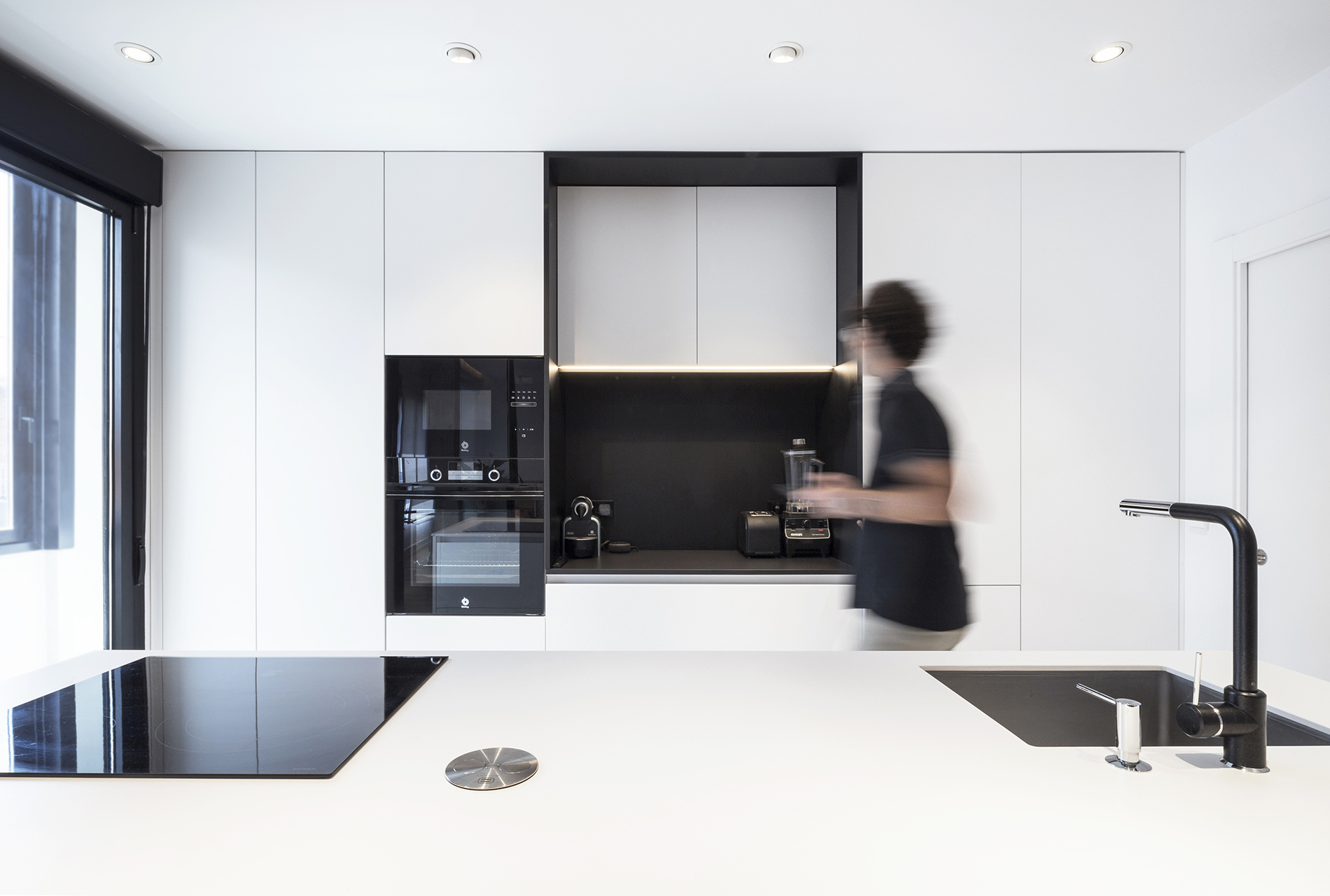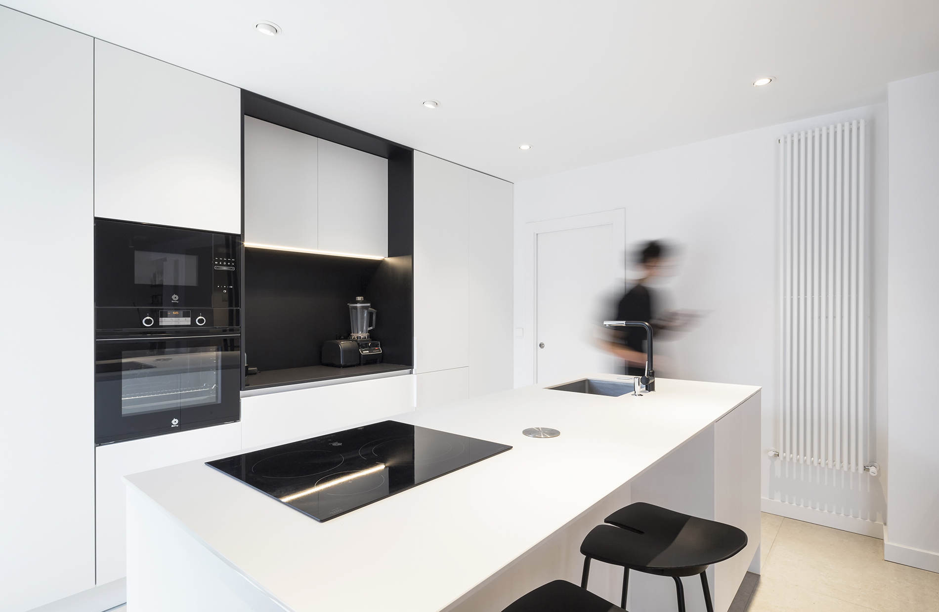 El eje sur que configura el salón-comedor-cocina es un gran espacio abierto que tiene como telón de fondo la isla y el frente de muebles altos de la cocina, que queda separada del salón – comedor por una división corredera transparente construida al modo de “verrière” con acero lacado en negro mate y vidrio. En torno al eje norte se articulan tres dormitorios. El programa se completa con un baño, un aseo de cortesía y vestíbulo. La vivienda cuenta además con un balcón-galería. El suelo de la vivienda es de madera de roble natural a excepción de las zonas húmedas que tienen un gres porcelánico de gran formato.