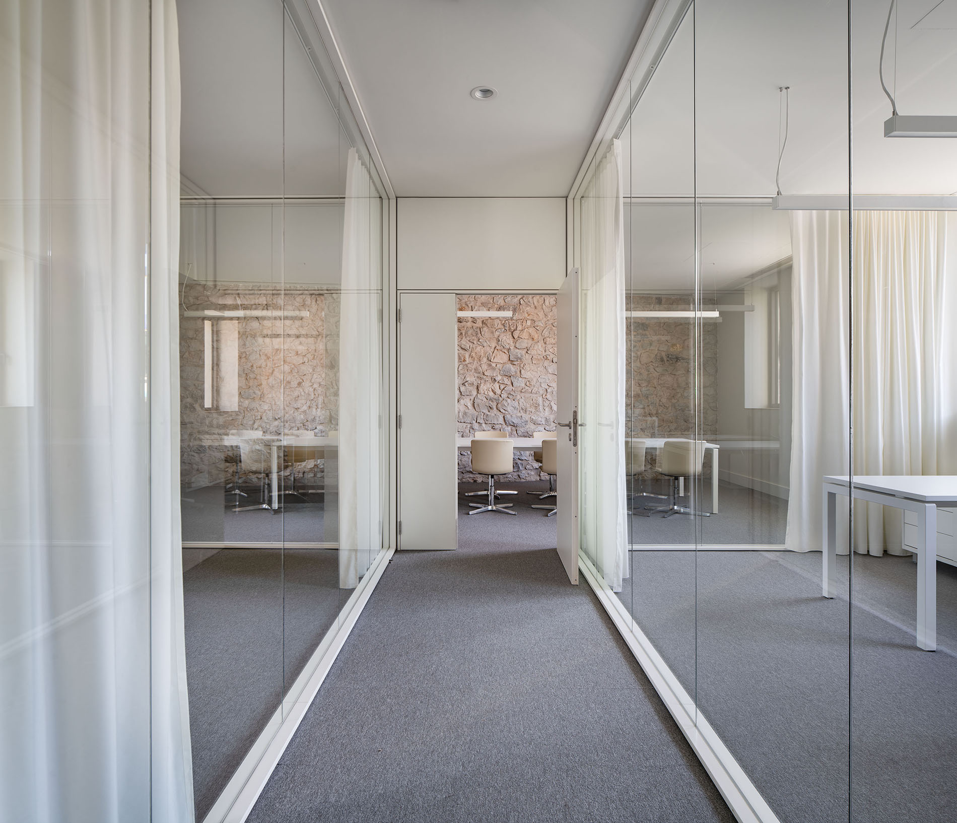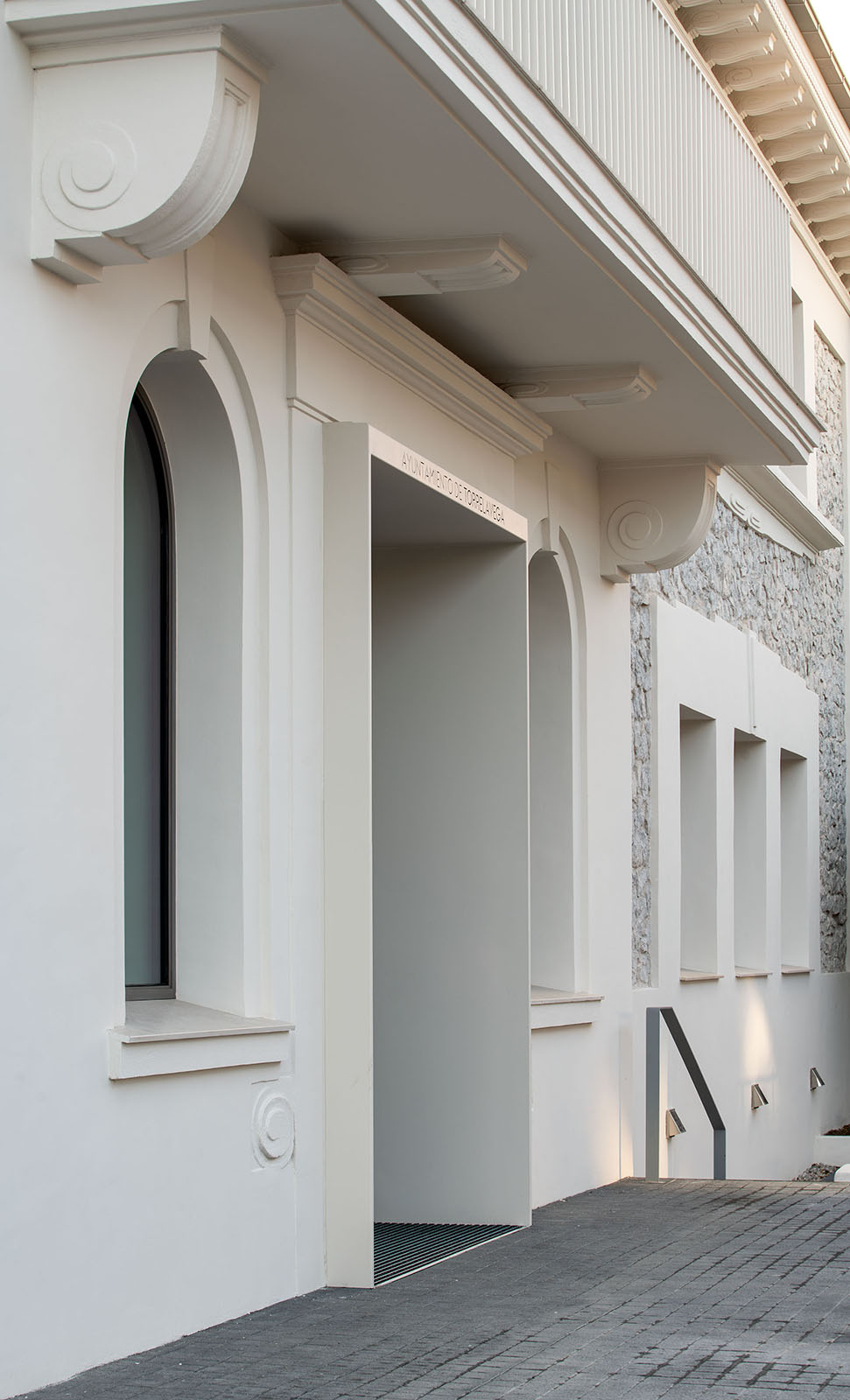 Las nuevas carpinterías metálicas de tono oscuro se retranquean aprovechando todo el ancho del muro potenciando la profundidad de los huecos en los muros de mampostería.