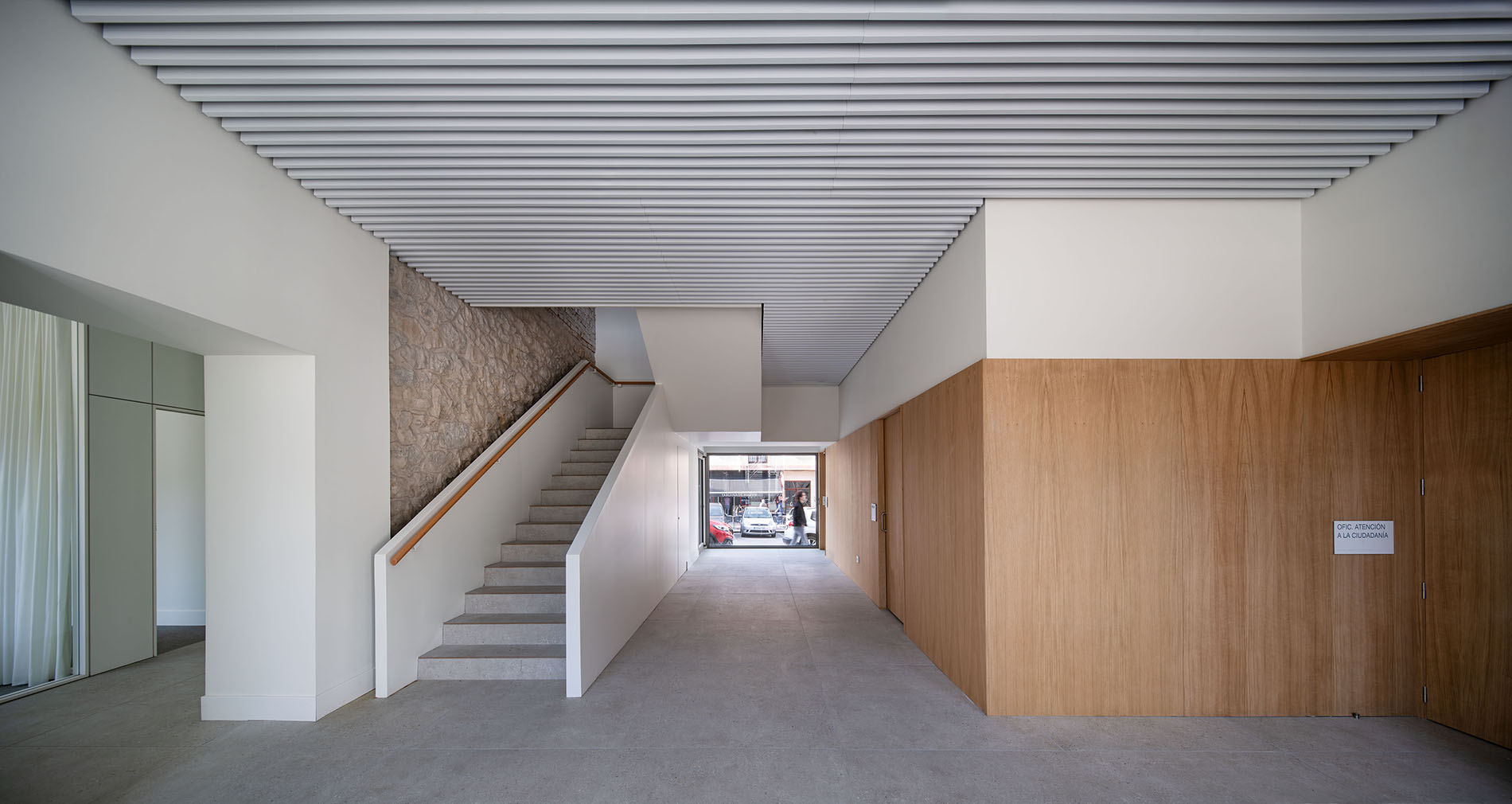 Con la misma idea de generar un espacio de relación entre la administración y la ciudadanía, se propone la apertura del espacio de retranqueo del que dispone la parcela para entregárselo a la ciudad en forma de pequeña plaza de acceso al edificio. De este modo se elimina la barrera existente entre edificio y ciudad respondiendo al carácter de bien público que le corresponde. Se demolerá el cerramiento existente y se generará una escalinata de acceso integrada con una rampa lateral que permita el acceso a personas con movilidad reducida. La zona libre se destinará a una zona estancial con bancos y vegetación.