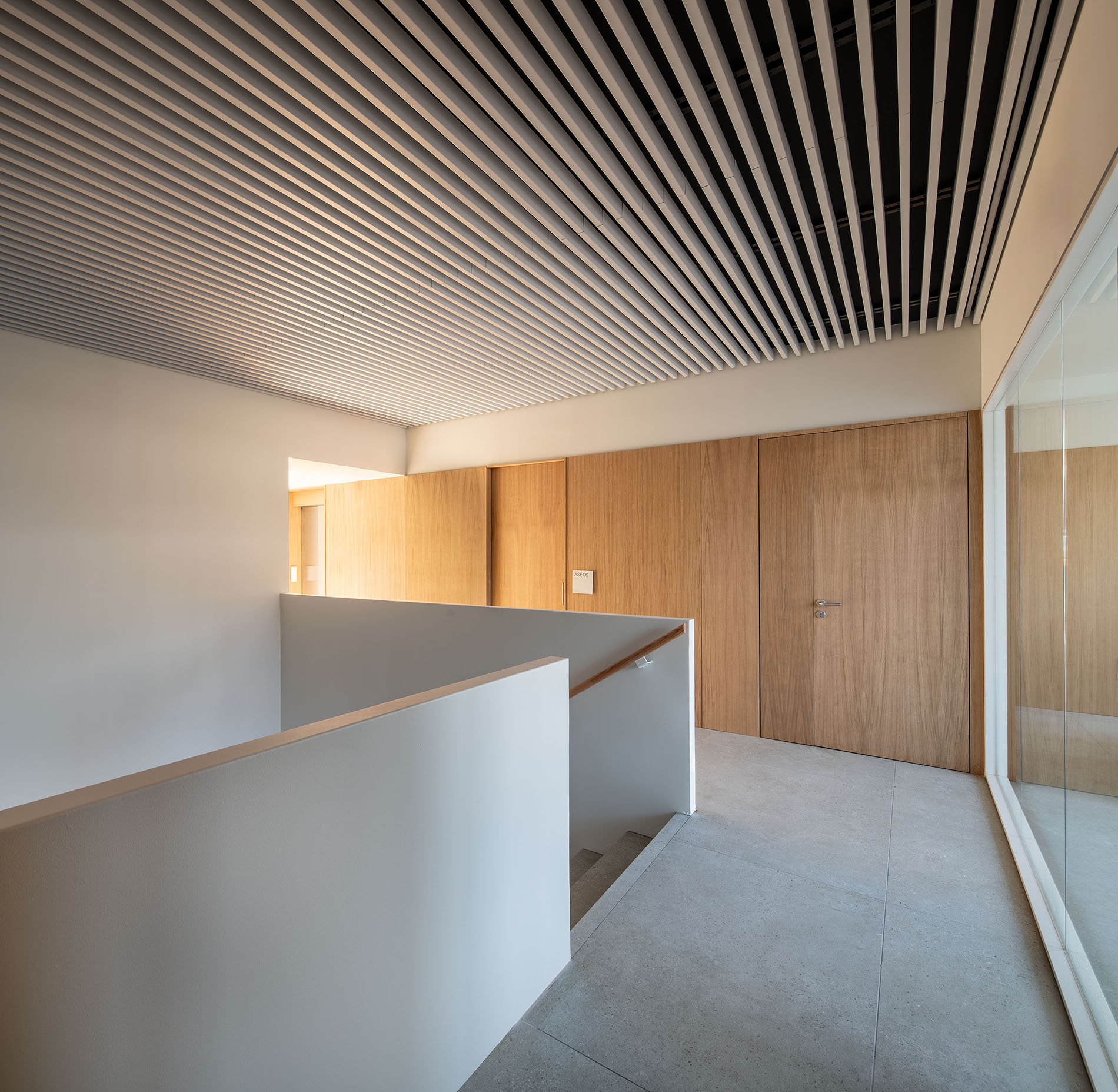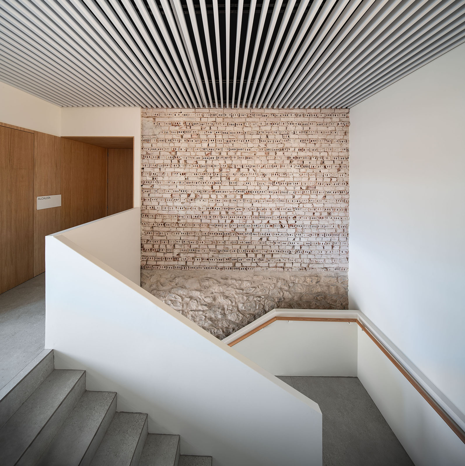 La configuración estructural y espacial del proyecto original del edificio se definía por la clara distribución de un núcleo central flanqueado por dos alas laterales. Esta configuración quedó dañada por la ejecución de un volumen trasero que desvirtuaba la pureza geométrica y simétrica del proyecto y por la introducción de una segunda escalera de servicio que rompía el eje estructural que separaba el núcleo central con el ala norte. La propuesta planteada en el presente proyecto trata de recuperar la configuración original eliminando la segunda escalera (originalmente de servicio), innecesaria tanto por uso como por normativa. Mediante la eliminación de esta escalera, se restituye la configuración original del mismo recuperando los ejes estructurales y espaciales que dividen núcleo y espacios adyacentes.