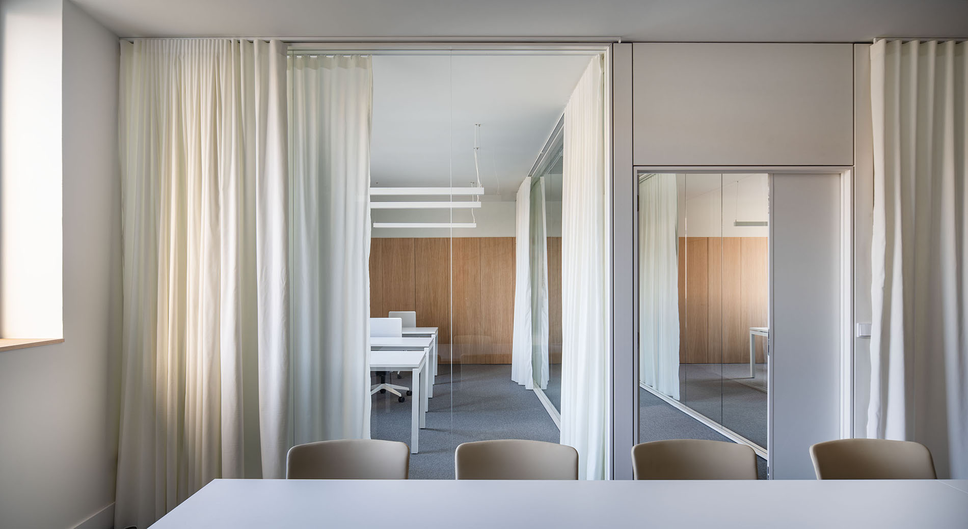 El volumen trasero quedará unido ahora al vestíbulo principal mediante la apertura de un gran hueco en el muro posterior de la edificación. Esta apertura unifica la salida original del edificio con las diferentes aperturas que se le han practicado a lo largo de los años. A su vez, se acristalará la fachada del volumen trasero de forma que se produzca una continuidad visual que conecte ambas fachadas del edificio.
