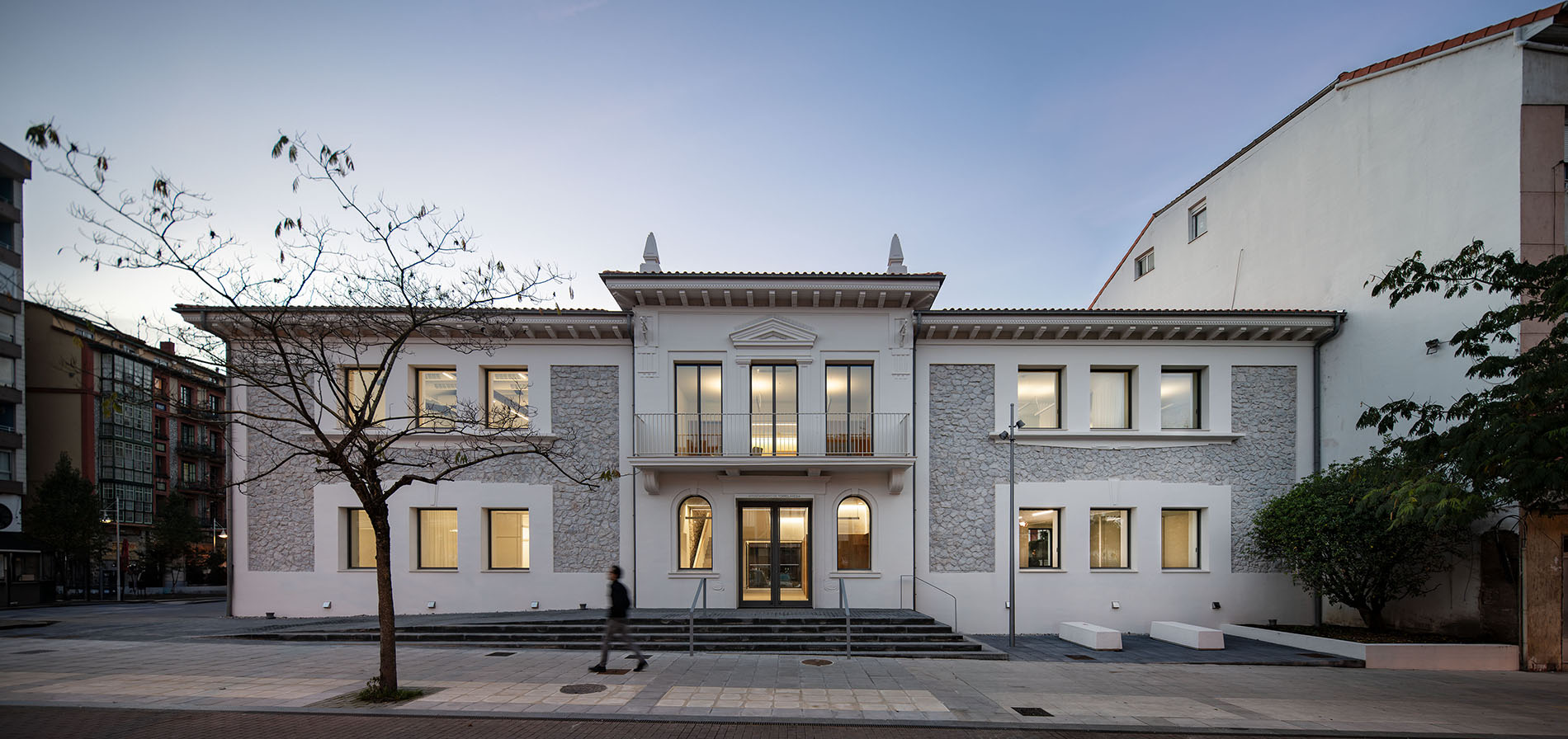 La propuesta respeta la composición y ornamentación original del edificio. Más allá de los trabajos propios de saneado de la mampostería y reparación o sustitución de revocos, se propone singularizar el edificio mediante el tratamiento monocromo de la fachada. Se le confiere así cierta abstracción aplicándole una coloración gris blanquecina al conjunto, tanto a los revocos como al velo que cubre la mampostería.