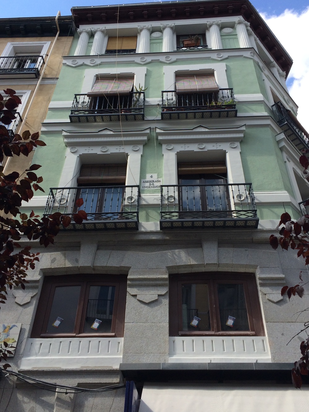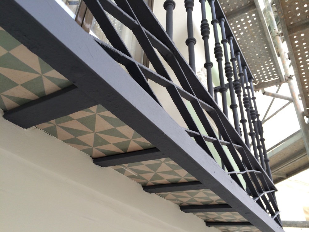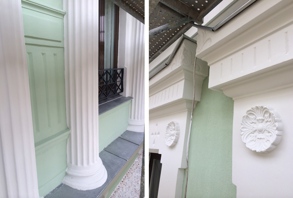 El mayor reto de la obra consisitía en recuperar los elementos decorativos de fachada, en su mayoría de escayola, que se encontraban bastante deteriorados. Se sacaron moldes de los medallones y de los capitales de las columnas que estaban en mejor estado de conservación para reproducirlos y sustituir los mas dañados.