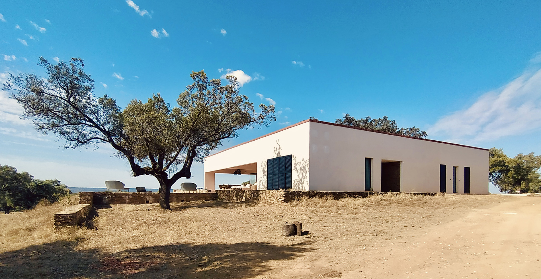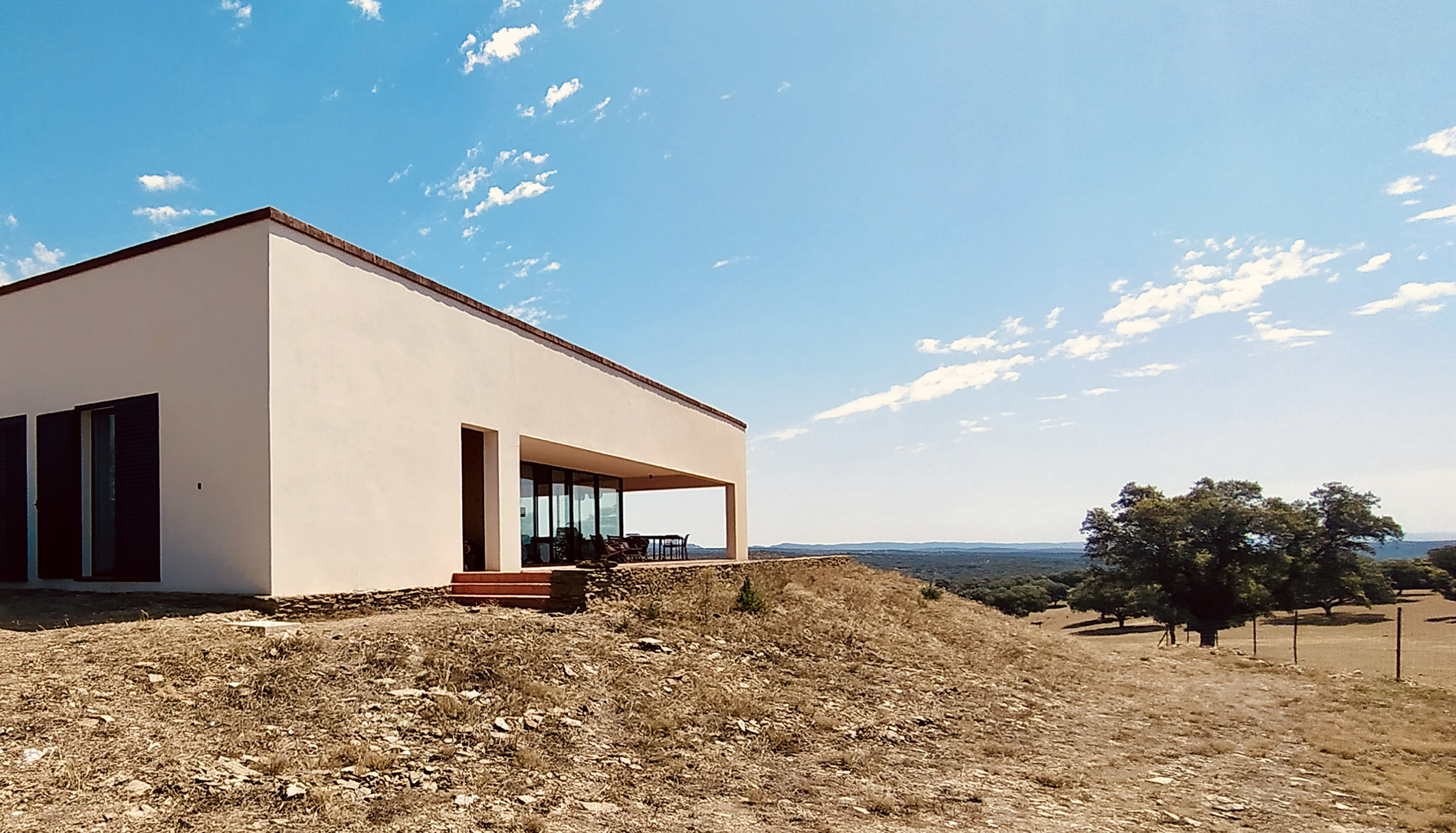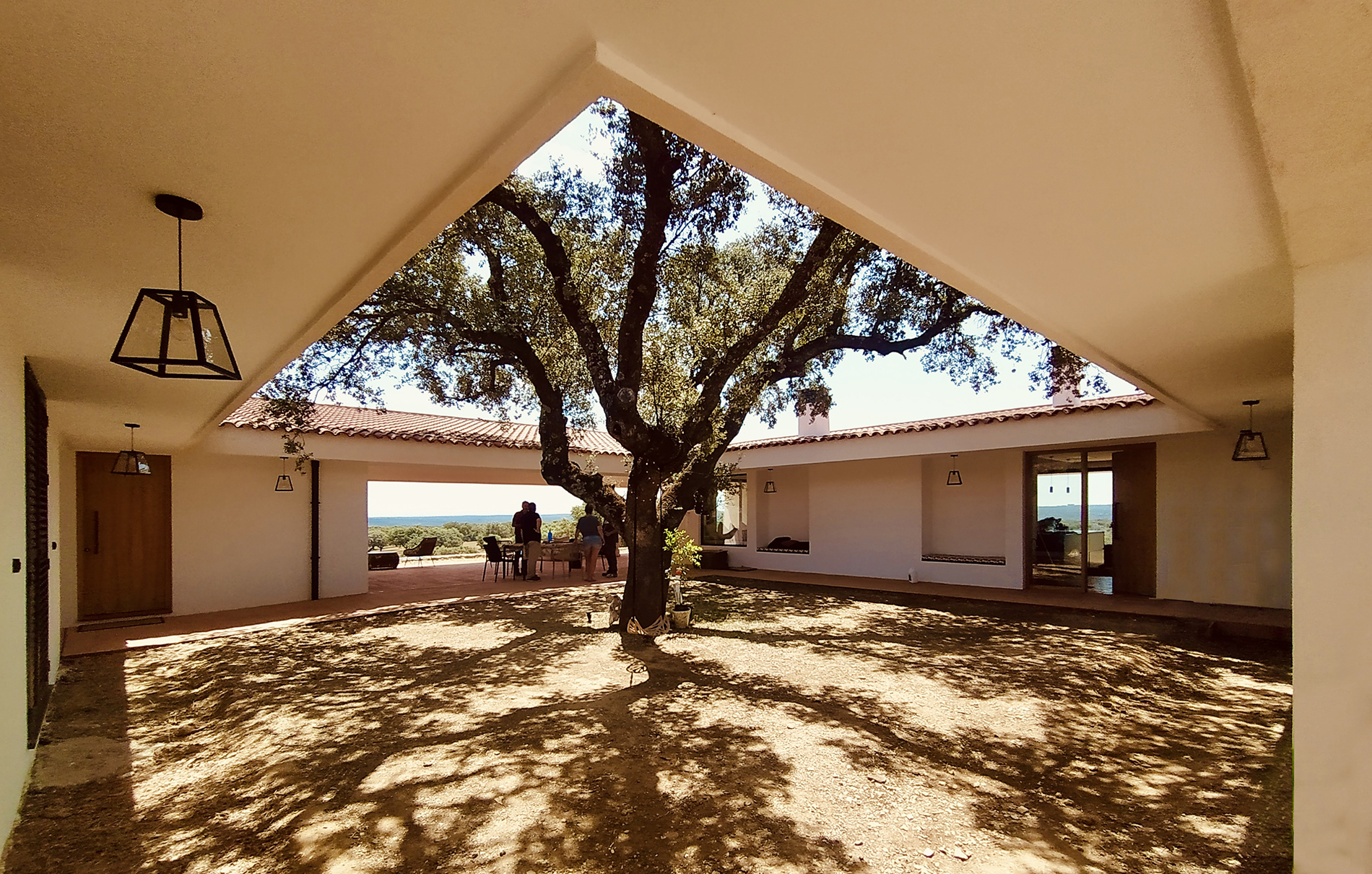 La vivienda se sitúa en un extenso encinar de la provincia de Cáceres, en una finca dedicada a usos ganaderos. El proyecto se organiza en torno a una encina preexistente, que se convierte en el centro del patio principal y articula la vida de la casa.
