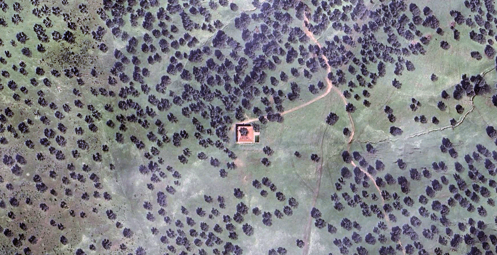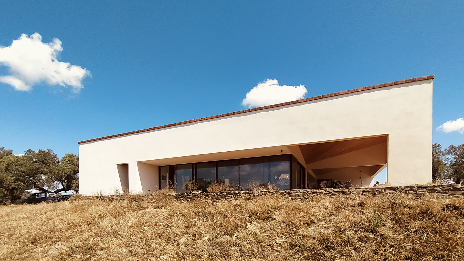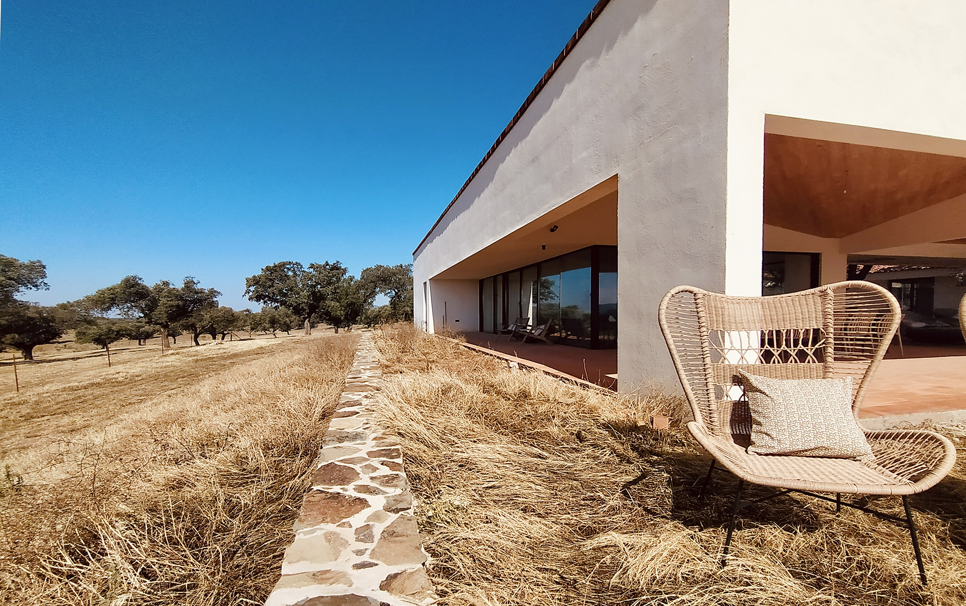 La vivienda se sitúa en un extenso encinar de la provincia de Cáceres, en una finca dedicada a usos ganaderos. El proyecto se organiza en torno a una encina preexistente, que se convierte en el centro del patio principal y articula la vida de la casa.