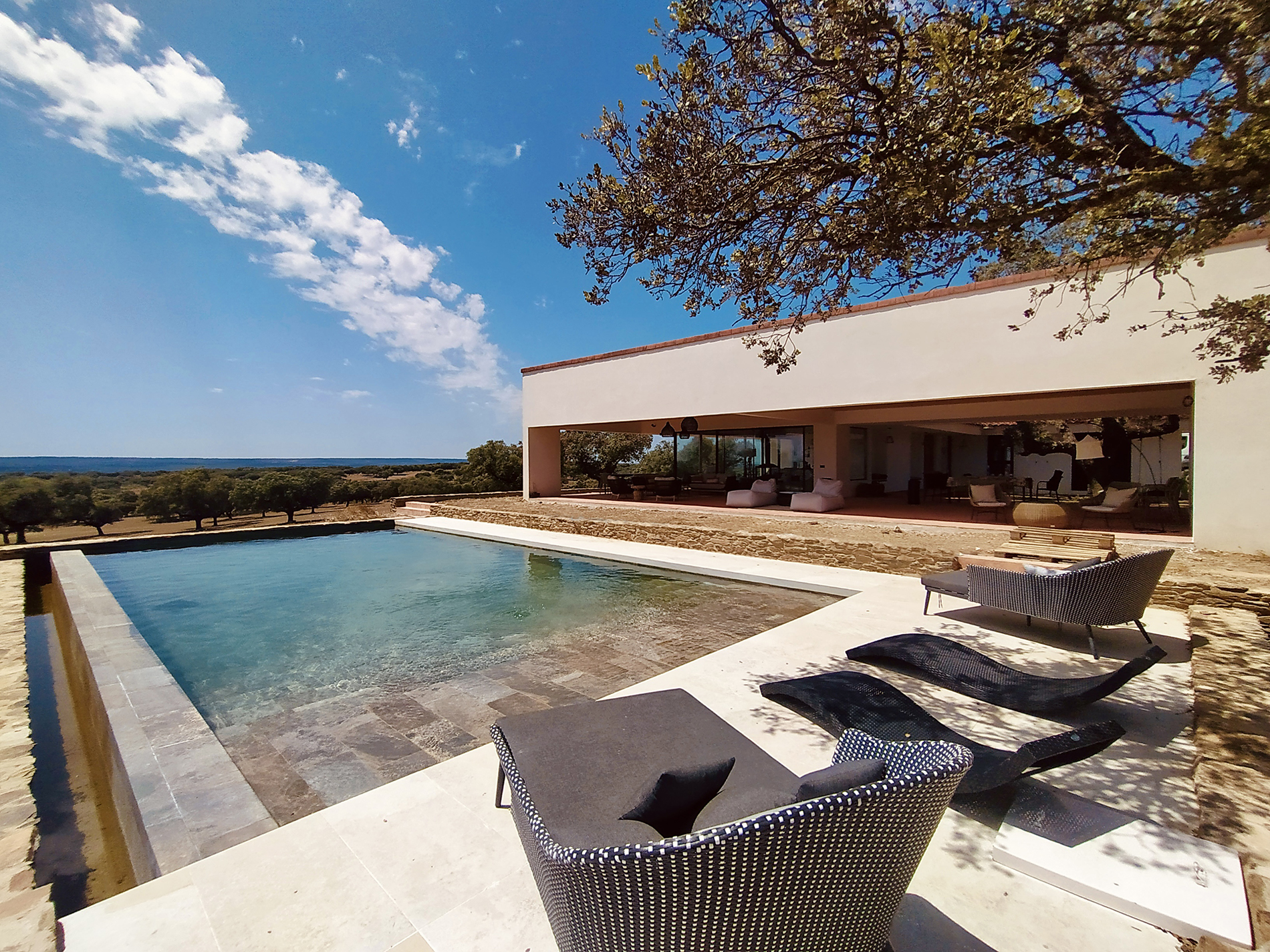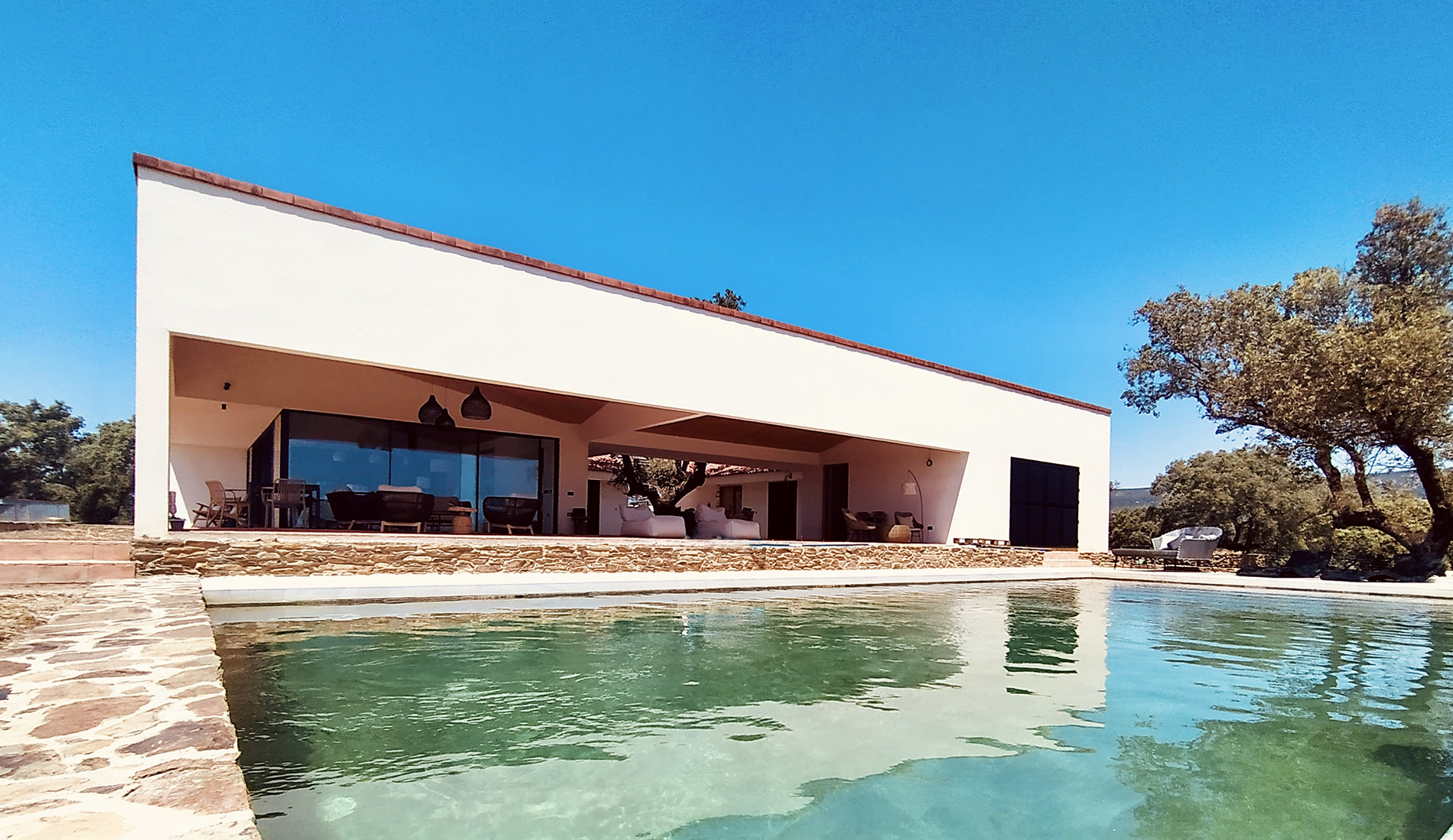 El proyecto combina referencias a la tradición vernácula —el patio, la materialidad, la relación con la topografía— con un lenguaje arquitectónico contemporáneo, de volúmenes claros y espacios fluidos. La vivienda se inserta así en el paisaje sin competir con él, estableciendo un diálogo directo entre naturaleza y arquitectura.