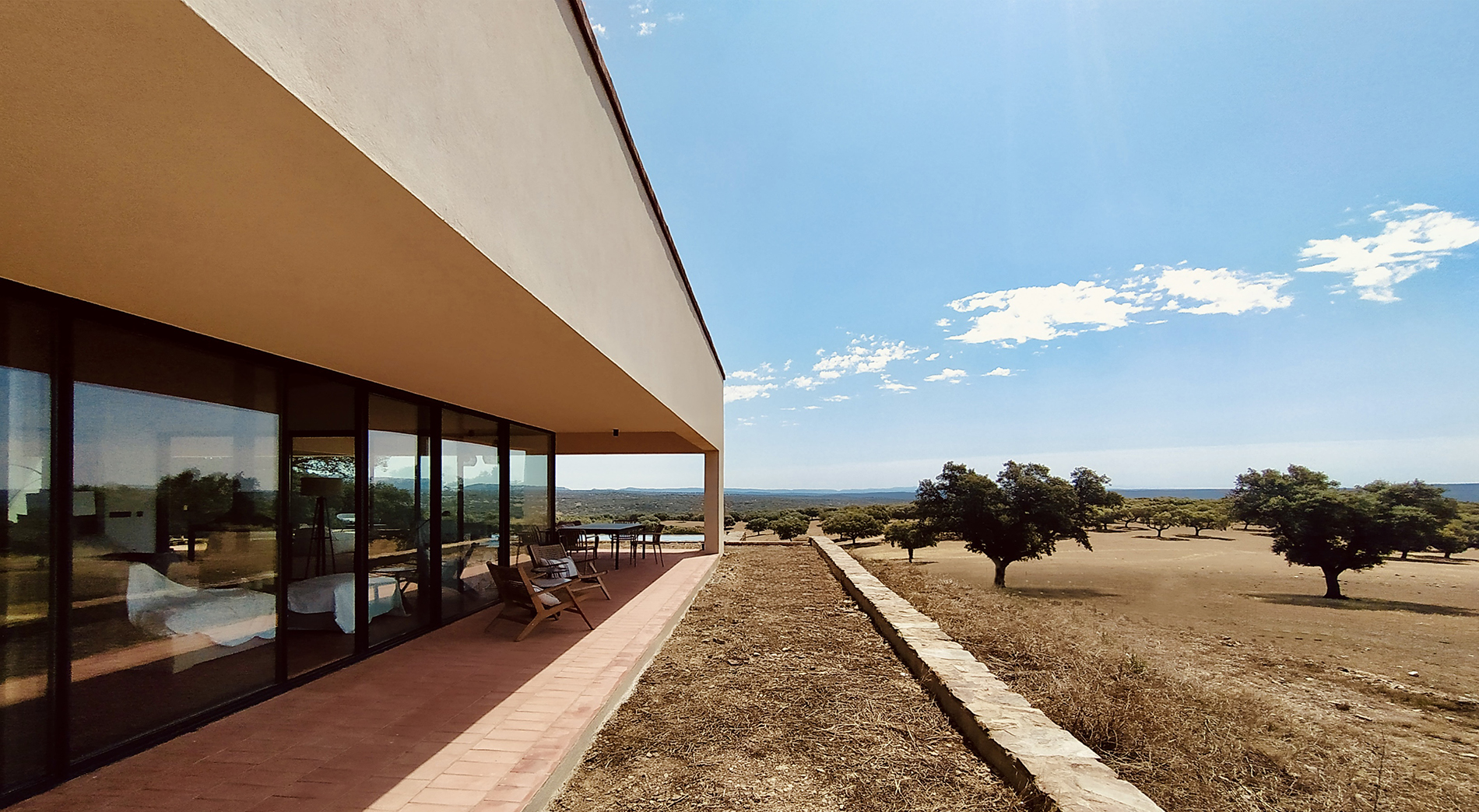 La tipología recupera la idea del impluvium romano, reinterpretado como espacio de relación, ventilación y control climático. La disposición de las piezas construidas busca protegerse del norte y el oeste mediante la masa forestal y abrirse al sur y al este hacia las vistas del Parque Nacional de Monfragüe.