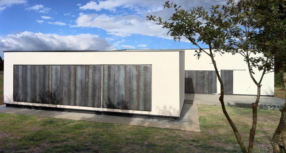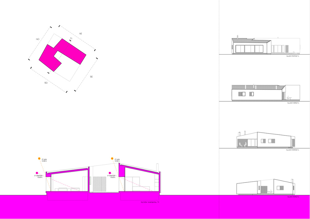 En los desplazamientos y quiebros entre ambas piezas aparecen los espacios exteriores vinculados a la vivienda a modo de terrazas que cuando los amplios ventanales proyectados en la zona “de día” están abiertos conforman un espacio continuo exterior-interior. Las operaciones geométricas efectuadas sobre el volumen principal así como su orientación se han diseñado en función del soleamiento en sus coordenadas geográficas. El diseño de la sección se ha pensado igualmente en función del sol de manera que permite su entrada completamente en invierno y la evita en verano.