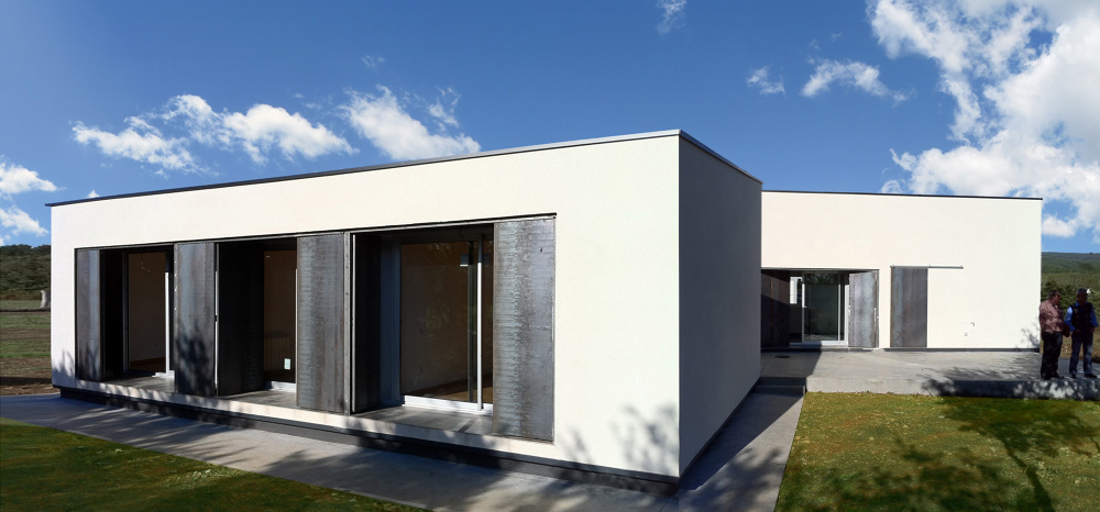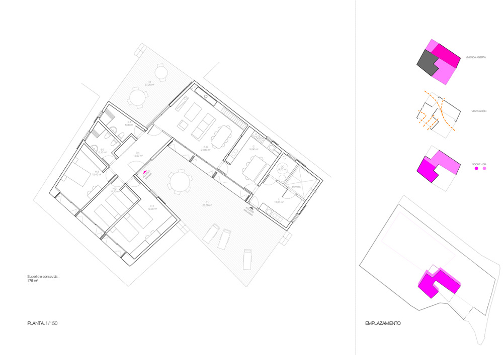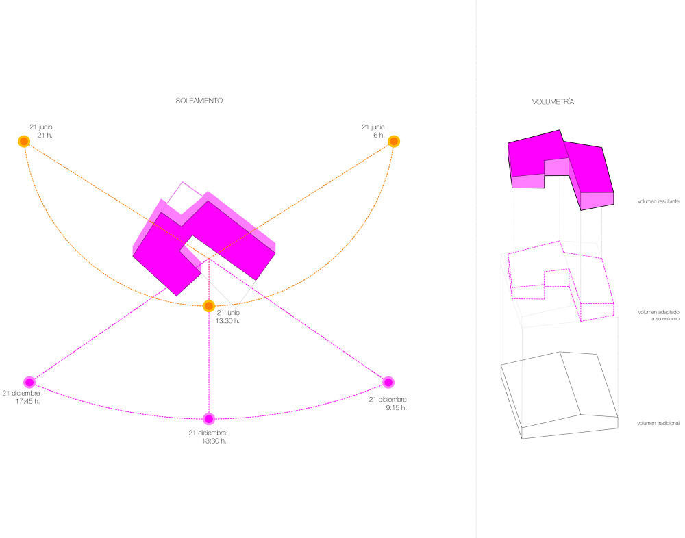 La propuesta se genera a partir de un volumen tradicional rectangular de una única planta con cubierta a dos aguas. Nos ha parecido importante que la edificación resultante fuera claramente identificable con la idea de vivienda presente en el imaginario colectivo y en el particular de los clientes. Al volumen del que se parte se le practican una serie de recortes, quiebros y giros en función de su orientación y ubicación en la parcela. Como resultado se obtiene una vivienda estructurada en dos volúmenes, que se corresponden con las dos vertientes de cubierta, albergando uno las zonas de día y el otro las de noche.