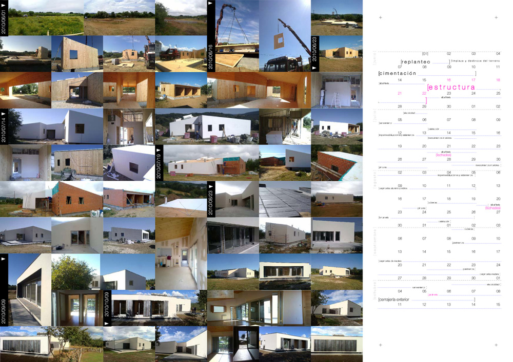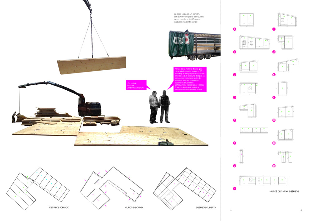 La vivienda se eleva sobre la cota de la parcela mediante un forjado sanitario sobre el que se alzan los muros de carga perimetrales sobre los que apoyarán las losas inclinadas de cubierta, ambos ejecutados con paneles de madera contralaminada. Un material de una gran capacidad portante con espesores reducidos. Además se reduce de forma importante el CO2 emitido y, en general, la energía primaria utilizada en el edificio, el consumo de agua implícito en la obra, así como la generación de residuos. Además obtenemos superficies envolventes perfectamente transpirables a la par que totalmente secas (siendo el único material con unas prestaciones estructurales y ambientales semejantes). El tiempo de obra se reduce a valores comparativamente ínfimos.